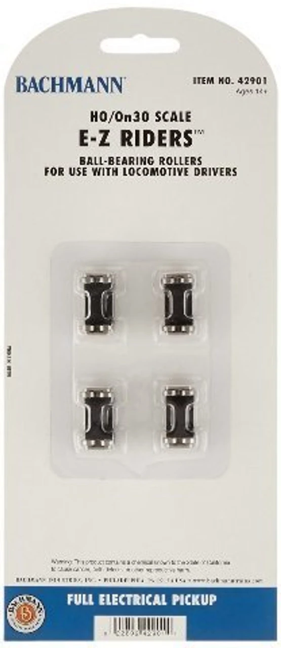 Features: 4 per pack for use with locomotive drivers full electrical pickup THESE ROLLERS HAVE BALL BEARINGS FOR USE WITH LOCOMOTIVE DRIVERS. WARNING: CHOKING HAZARD – SMALL PARTS! NOT INTENDED FOR CHILDREN UNDER 3. HO/On30 E-Z RIDERS with BALL-BEARING ROLLERS – 4/pk. Use for testing or displaying your Locomotive. 4 per pack, for use with locomotive drivers, full electrical pickup.