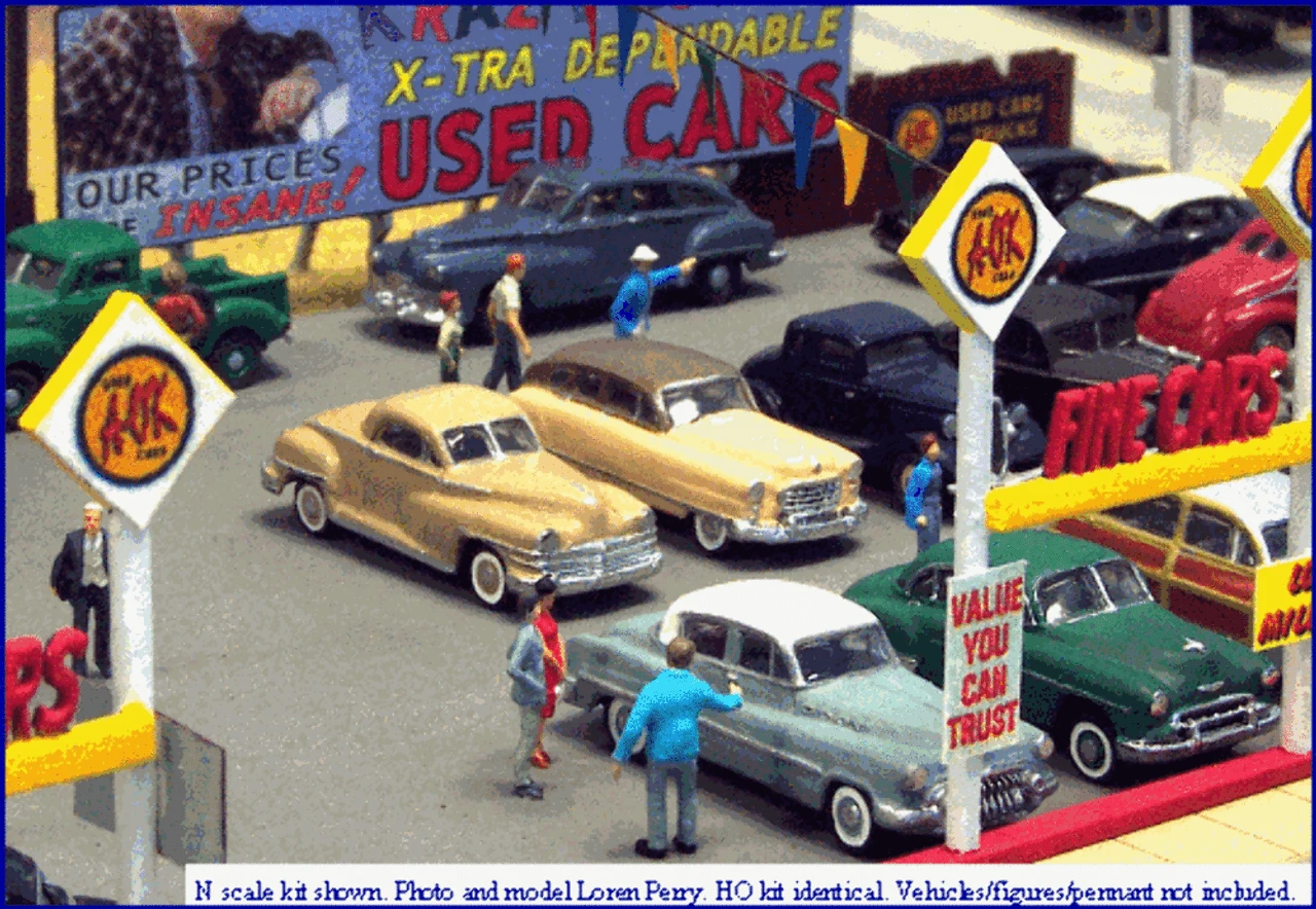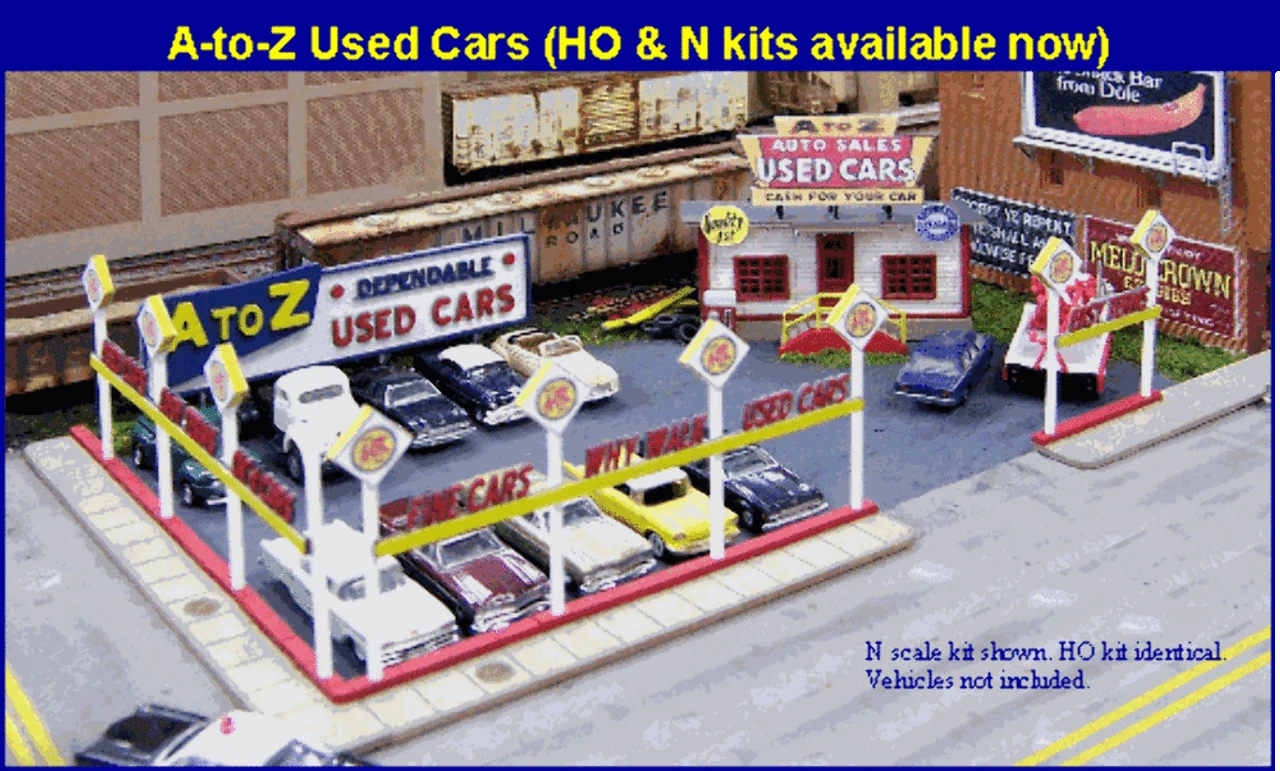 Includes laser-cut sidewalks and curbs with curbside laser-cut signage as shown above. Also includes a large 3-D laser-cut A-to-Z Dependable Used Cars billboard to install on the back of your lot layout.