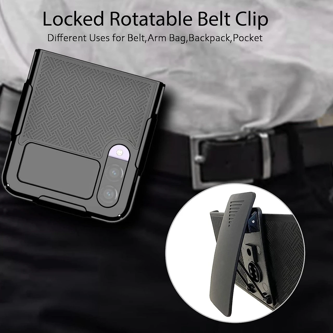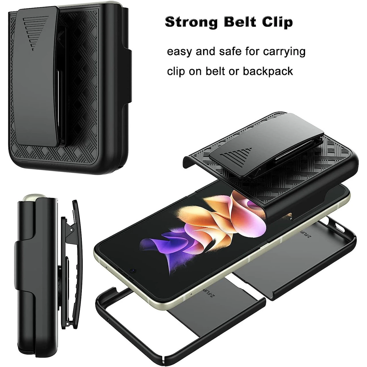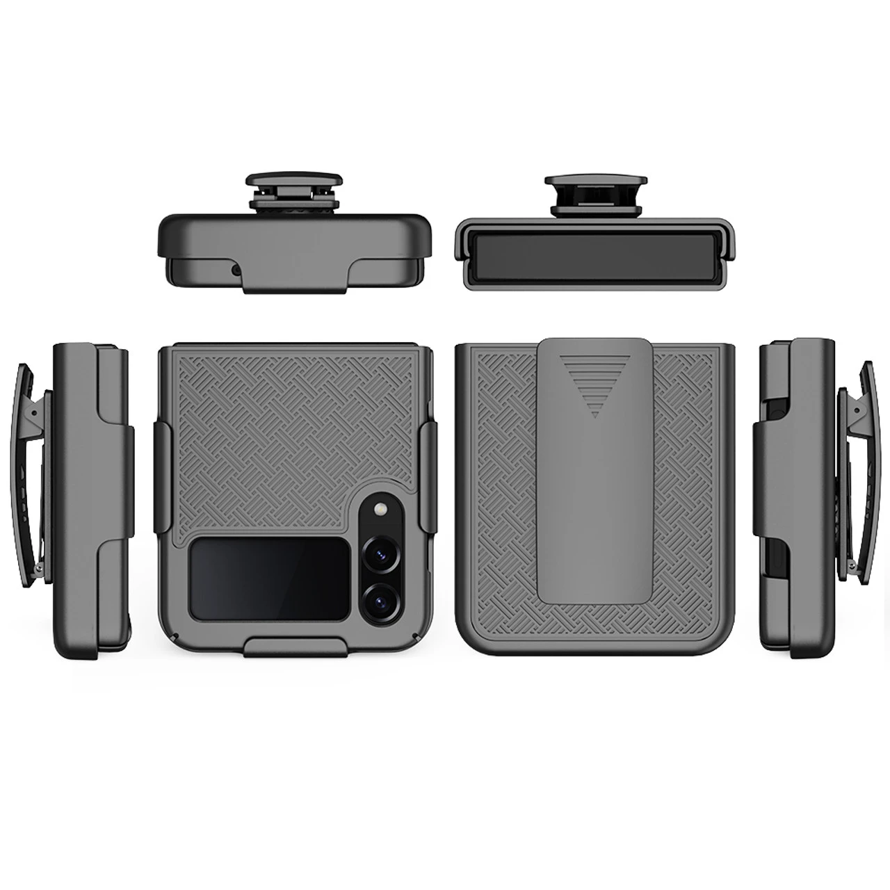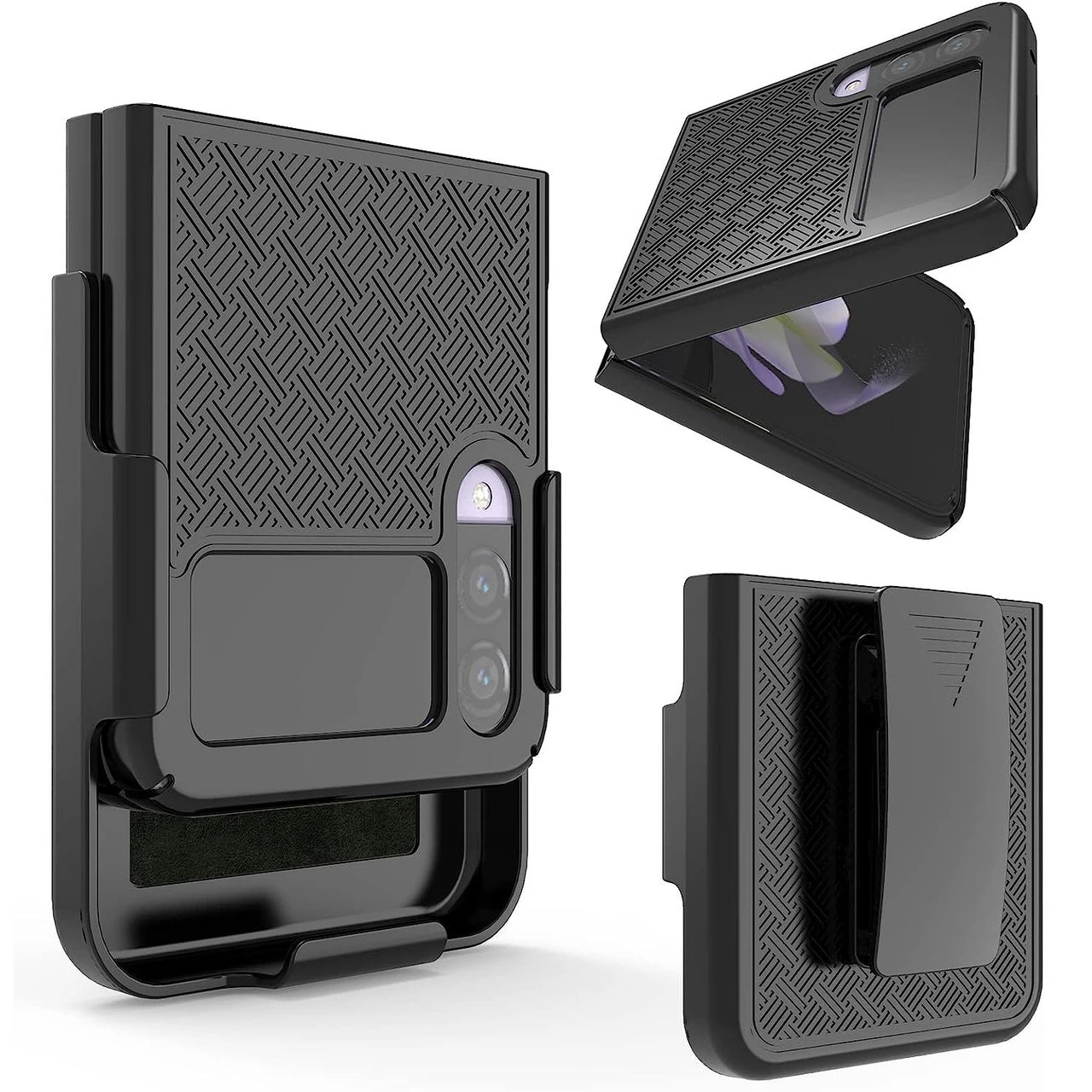 Combining protection with functionality, this shell plus holster case allows you to carry your Samsung Galaxy Z Flip 4 with ease while providing maximum all-around protection. The case easily slips into the heavy duty holster, and the belt clip includes 180-degree rotation capability so you can position the holster at any desired angle. The holster and hard shell combo case comes in all black with rubberized soft coating, which aids as an extra step of precaution against accidental cosmetic damage. Look no further! The slim profile and the multi-functionality of this product merge style, versatility, and supreme protection.
