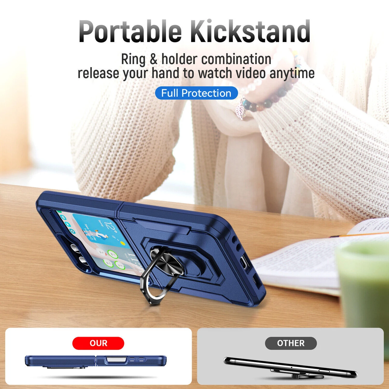 - Pull the ring out and have a handy viewing stand to comfortably watch your favorite show.